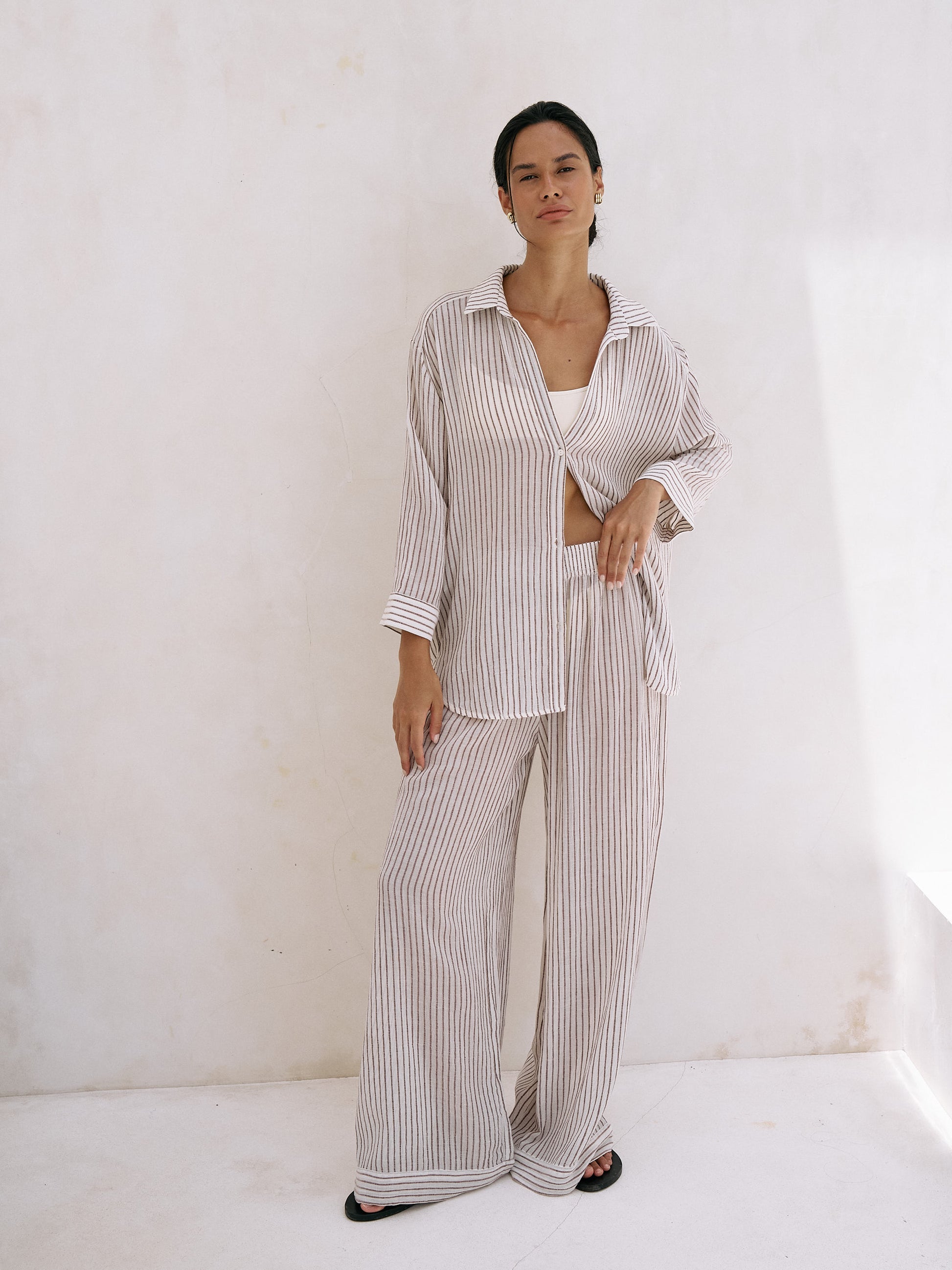 Bu modern Voyage Set Burgundy Stripes, %100 pamuk dokulu ve hafif dokusu ile sıcak yaz günlerinde ferahlık getiriyor. Transparan dokulu pamuklu kumaş yapısı ile karşı konulmaz derecede rahat hissetmenizi sağlar.